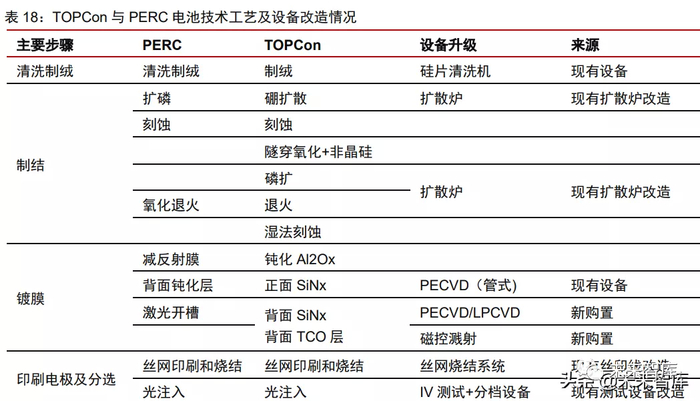 目前 PERC 电池产线单 GW 投资在 1.5-2.0 亿元,而仅需 6000-8000 万元即可改 造升级为 TOPCon 产线。在面临大规模 PERC 产线设备资产折旧计提压力下,改造为 TOPCon 拉长设备使用周期,降低沉没风险,是未来 2-3 年极具性价比的路线。(报告来源:未来智库)