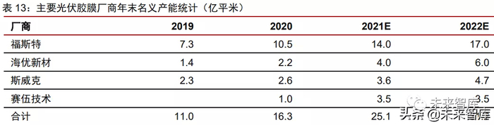 胶膜名义产能加快扩张,但受制于原材料短期供应瓶颈,实际有效生产能力受限。2020 年起光伏胶膜企业加快扩产步伐,预计主要新产能将于 2021H2 起陆续建成,名义产能有 望于 2021/2022 年底分别增至 25/31 亿平米。但由于年内产能投放时点普遍靠后,尤其是 受制于光伏级 EVA 树脂供应限制以及成本端压力,预计胶膜新产能释放节奏将受明显制约。