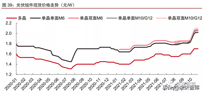 大尺寸、双面组件产品享受 3-5 分/W 小幅溢价。组件产品亦延续差异化定价,其中 大尺寸的 M10/G12 组件相较于 M6 组件享有 3-5 分/W 的产品溢价,双面较单面组件亦基 本维持 3-5 分/W 的价差,本质上反映了更具降本增效能力的产品在终端获得更高的接受度。