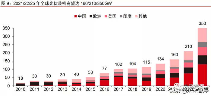 预计2021/22/25 年全球光伏新增装机望达 160/210/350GW,未来 5-10 年 CAGR 有 望维持 20%-25%。