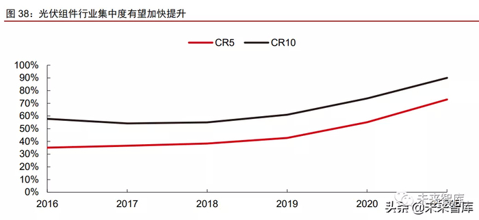 全球竞争壁垒提升,组件厂商份额加速集中。近年来全球光伏市场日趋多元化,对组 件厂商销售网络搭建和全球营运能力提出更高要求。国内龙头组件厂凭借销售渠道和客户 资源积累,以及产品优势和品牌影响力提升,竞争力进一步增强。同时,头部企业通过一 体化(或准一体化)产能扩张,进一步提升盈利能力和抗风险能力,推动组件环节竞争格 局加速优化。2020 年,全球组件CR5 和 CR10 分别达 55%和 74%左右,我们预计 2021 年有望进一步提升至 70%和 90%以上。