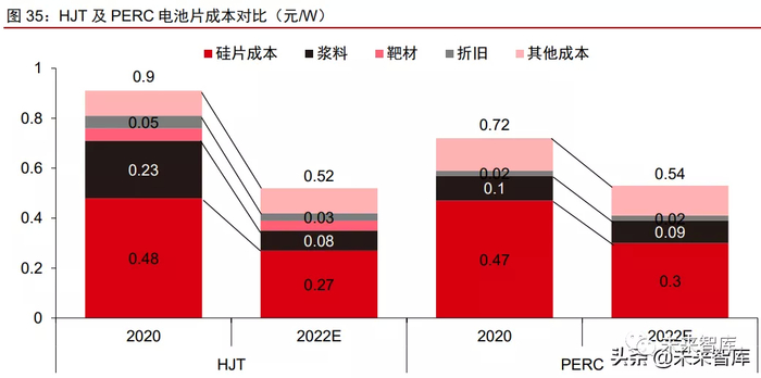 目前 HJT 电池生产成本 0.9 元/W 以下,高于 PERC 的成本 0.7 元/W;预计 2022年 HJT 电池的硅片成本和非硅成本较目前降低 40%+,相较于单晶 PERC 电池的性价比优势有望逐步显现。目前产业界主要从银浆、硅片及设备三方面着手: