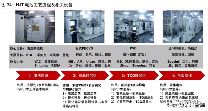 3)工艺流程更加简化,提 效降本空间更大。相比 PERC 的 8 道和 TOPCon 的 10 道工艺,HJT 仅需 4 道工序即可完 成,在<250℃低温环境下制备,相比于传统 P-N 结在 900℃高温下制备,有利于薄片化 和降低热损伤来降低硅片成本,从生产效率和产品良率上更有优势和提升空间。