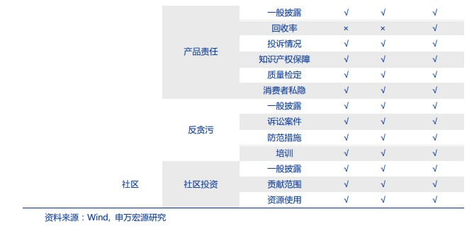 A股社会信披均采用结合自身行业特征的主题模式,有共性但难量化。以“客户和消费者权益保护”为例:(1)宁波银行的主题名称是“保障客户权益”,通过加强消保体系机制建设、完善投诉管理以及流程管控,加大金融宣教来保障消费者权益。(2)贵州茅台的主题名称为“客户和消费者权益保护”,提出公司通过持续完善市场工作机制,科学把握投放节奏,强化巡视指导等措施,来切实维护消费者合法权益。(3)中国平安的主题名称为“消费者权益保护”,具体措施包括设立消费者保护委员会、执委会,以及制定相关的管理办法,来保障消费者的权益。(4)中国石油的主题名称为“消费者权益”,通过介绍“加油站3.0”的各种功能来描述对客户的增值服务。(5)万科的主题名称为“好服务”,分别从保障基本权益、规范服务要求、打造智慧服务来进行相关披露。