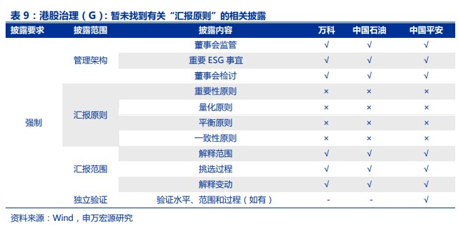 港股ESG报告中暂未找到有关“汇报原则”的相关披露。港交所要求治理信息应强制披露,但三家公司关于“汇报原则”的相关信息,暂未找到单独披露内容,可能公司已在其他报告中进行了相关披露,具体披露内容详见表9。