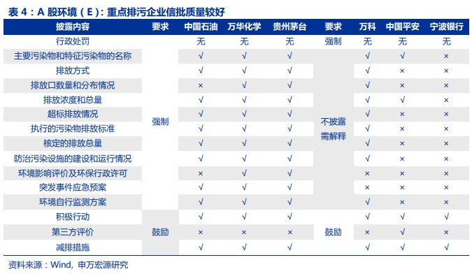 2.2环境(E):A股重点排污企业,信披质量有保证在我们选择的6个案例中,因为都在A股上市,所以均被沪深交易所的ESG信披规则约束;但只有万科、中国石油、中国平安在港股上市,受港交所规则制约。我们用两张表分别列示其对沪深交易所(表4)、港交所(表5)规则的执行情况,第2.3、2.4节也均如此,下文不再赘述。
