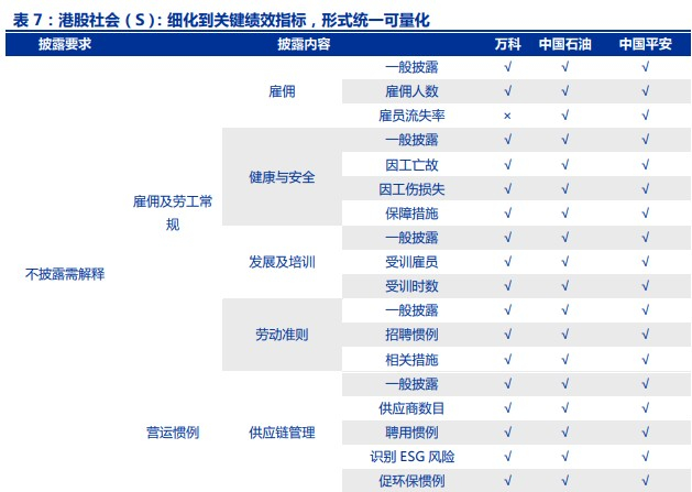 港股的ESG报告基本按照港交所要求进行了社会(S)信披,且细化到关键绩效指标,形式统一可量化。港交所对社会信息披露要求是不披露需解释,披露指标共有31项,3家公司的总体披露情况很好:中国平安披露了全部信息;中国石油除了未披露回收率外,其余30项均进行了相关披露;万科披露了29项,只有雇员流失率和产品回收率未进行披露。从披露形式上看,多为量化指标,更加标准化,便于横向对比和纵向对比。
