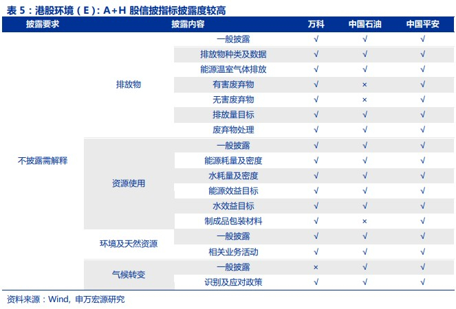 港股的环境披露情况总体令人满意。根据港交所发布的《管治、社会和责任指引》规定,环境信披科目共有17项,要求均为“不披露需解释”。在实际执行中,龙头公司的披露情况令人满意:中国平安针对每一项指标均进行了详细披露,万科和中国石油分别披露了16项和14项,但剩余未披露内容同样没有给出相关解释。