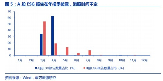 港股ESG报告内容更丰富,披露时间则相对分散。从平均页数上看:我们分别选取了2021年A股和港股市场上前100份ESG报告,两者的平均页数分别为34、67页,港股ESG报告的披露内容更加丰富。从披露时间上看:沪深交易所对此没有明文规定,但A股往往在年报季同步披露ESG报告。港交所要求在财务年结日后3个月内发布ESG报告。但由于香港上市公司的年结日是自主选定的,因此实际ESG报告的披露时间更加分散。