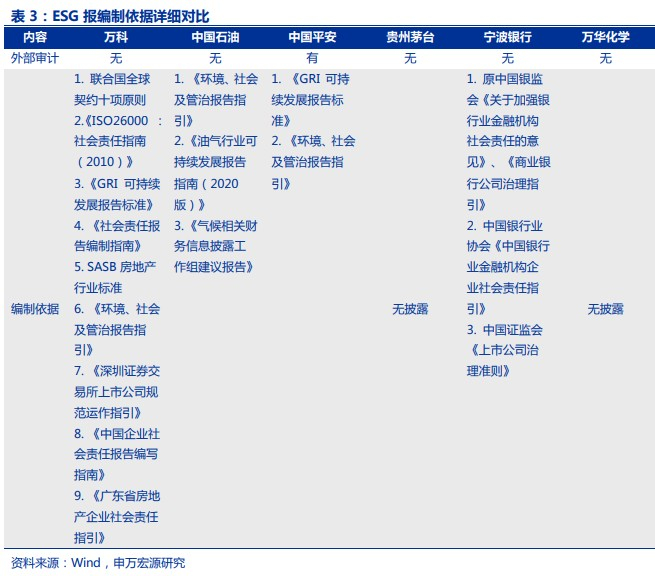 (1)在最重要的环境(E)信披环节,沪深交易所根据企业是否重点排污单位,其信披要求有很大不同。此外,再考虑到金融、非金融行业的信披重心也有很大差异,我们在A股、港股市场都选了3家分别代表:金融企业,重点排污企业,其他企业。