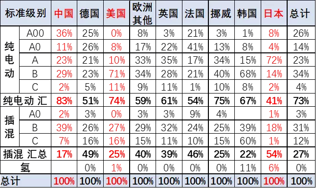 中国的近期结构升级推动的世界车型结构提升。中国A00级纯电动的份额下降到中国新能源车占比的38%,A级车占比提升到23%,导致世界的架构也是A级车占比提升明显。