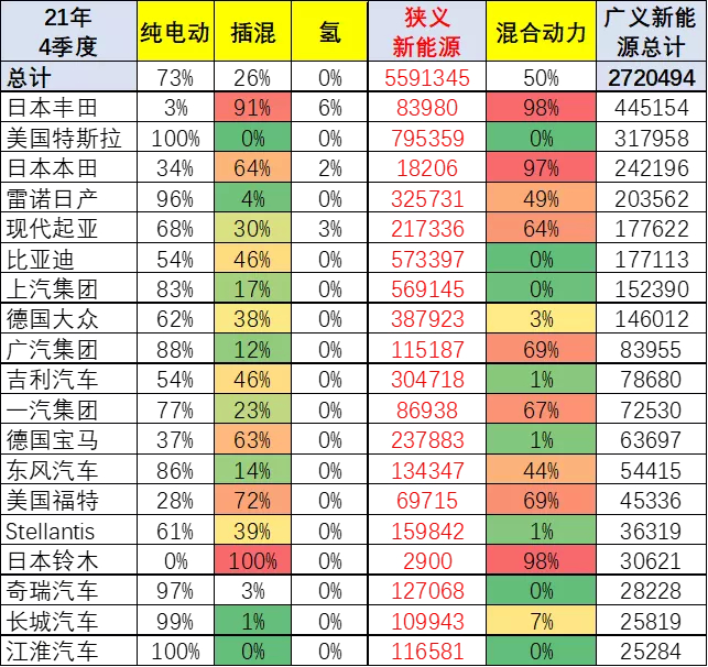 世界各厂家新能源差异明显,丰田(TM.US)的混合动力超强,而特斯(TSLA.US)只有纯电动,且占据绝对主力地位。