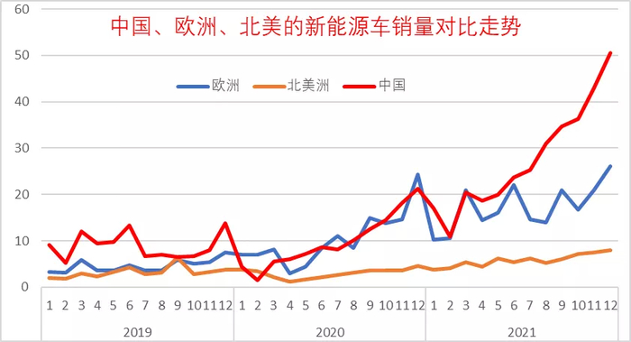 从新能源车的区域市场走势看,2020年欧洲始终是加速上行。2021年欧洲新能源车市场总体高位稳定。而中国新能源车市场2021年持续走势强劲,3-4季度持续加速上行。美国市场新能源车相对低迷和稳定。