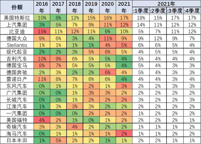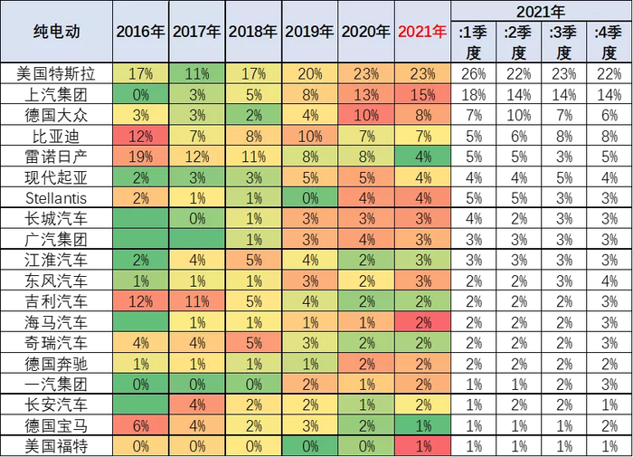 上汽集团的份额从2018年的5%上升到19年7%,随后上升到20年的12%和21年的14%的份额,表现相对较强。