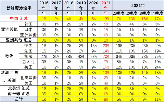 2021年4季度世界新能源车结构是欧洲市场较强,亚洲其次,因此欧洲市场结构的纯电与插混持平的特征明显。法国与挪威的纯电动占比高。