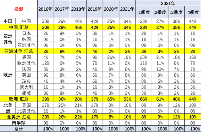 欧洲的插电混动份额从19年的35%,上升到20年的64%,又下降到21年的53%的水平。