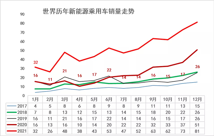 近几年减速趋势超预期。2019年的新能源车销量203万台,同比增长7%较强。前期连续几年世界新能源销量已经超越60%增速。2021年表现较强,全年增速回升到124%。