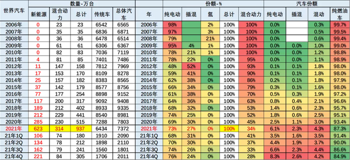 2021年全年全球广义新能源乘用车销量达到937万台。其中插混、纯电动、燃料电池的狭义新能源车全球销量达到623万同比增长118%。