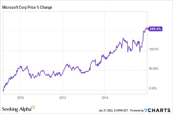 这是来自大金融危机的底部。在接下来的六年里,微软在此期间的复合年增长率为 23.2%。因此,您会看到图表中已经存在不应该存在的预设。