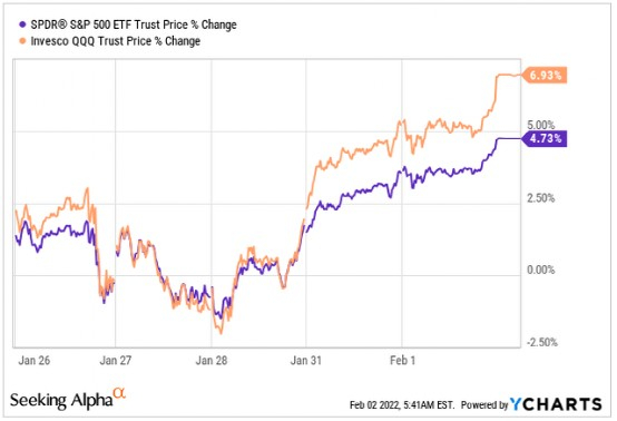 然而,在 FAAMG 股票的良好业绩的帮助下,这些指数在过去几天中恢复得很好。标准普尔 500 指数(纽约证券交易所代码:SPY)和纳斯达克指数(纳斯达克股票代码:QQQ)都增持了这些公司,因此它们的业绩非常受其业绩的影响: