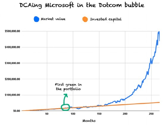 我们还以微软(MFST.US)为例来说明 DCA 在保护投资者免受繁荣时期的影响方面是多么有用。