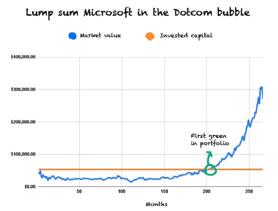 声称如果您在微软的巅峰时期(1999 年 12 月 27 日)进行投资,您将需要大约 16 年才能收回您的初始投资。这是图表。