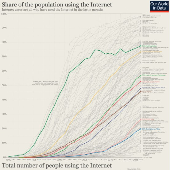 然而,互联网已经证明它实际上是下一件大事。那么,为什么这些公司中的大多数都倒闭了呢?投资者是对的,但他们为时过早。技术没有像现在这样在全球范围内得到采用。看看自 2000 年以来对互联网的访问是如何演变的:
