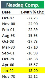 这些回撤也发生得非常快,2022 年 1 月是纳斯达克历史上 10 个最糟糕的月份之一: