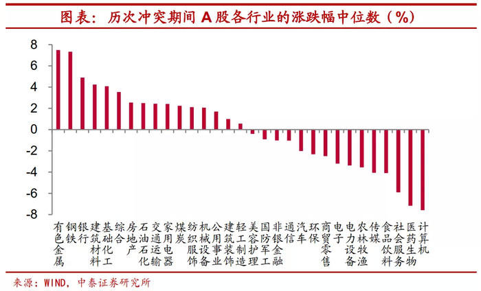 有色金属行业在A股表现最优。从历次冲突期间A股各行业的表现来看,有色金属行业的涨幅中位数领先于其他行业,这或许与战争爆发时期,投资者避险情绪升温导致黄金等避险资产相关股票上涨有关。此外,钢铁和银行股在战争爆发时整体表现也相对较好。而社会服务、医药生物及计算机行业受到冲突的负面影响或大于其他行业。