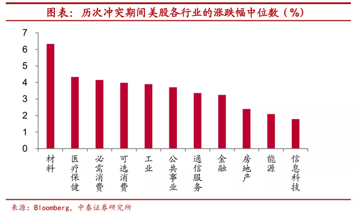 材料行业股票领涨美股。从历次冲突期间美股的行业表现数来看,标普500一级各行业均有所上涨。其中,材料行业的涨幅中位数领先于其他行业,医疗保健和必需消费也有不错的表现,而信息科技的涨幅垫底。可见整体而言,地缘冲突爆发对高成长性的板块不利。