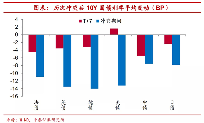 冲突期间债市收益率多数下滑。其次我们来看债券市场。除非一国宣布参战或遭遇战败,该国的国债利率存在上升风险以外,一般而言,债券在冲突期间或将受益。新世纪以来,由于历次地缘政治引发的冲突持续时间较短、波及范围较小,且参战国强弱差距明显,因此地缘冲突对于债市均未造成明显的影响。唯一的例外是利比亚战争时期,各国十年期国债到期收益率大幅回落,10Y美债利率显著回落142bp。正如前文所述,本次战争的规模相对较大、持续时间偏长,对股市、债市都产生了明显的影响,其余局部地缘冲突期间,国债利率仅有小幅变化,不过收益率普遍呈现下滑。