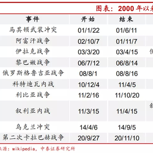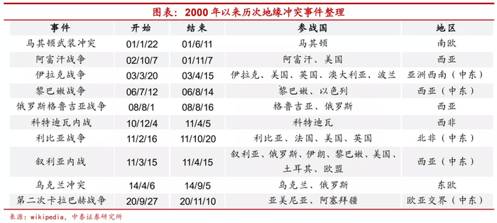从2000年以来,全球来看共经历过马其顿武装冲突、阿富汗战争、伊拉克战争、黎巴嫩战争、俄罗斯格鲁吉亚战争、科特迪瓦内战、利比亚战争、叙利亚内战、乌克兰冲突和第二次卡拉巴赫战争等10次比较典型的地缘政治冲突事件。由于历次冲突的规模、持续时间、波及范围等均有不同,对各类资产的影响程度也不尽相同,但整体来看,局部地区的冲突爆发对大类资产的走势影响有限。