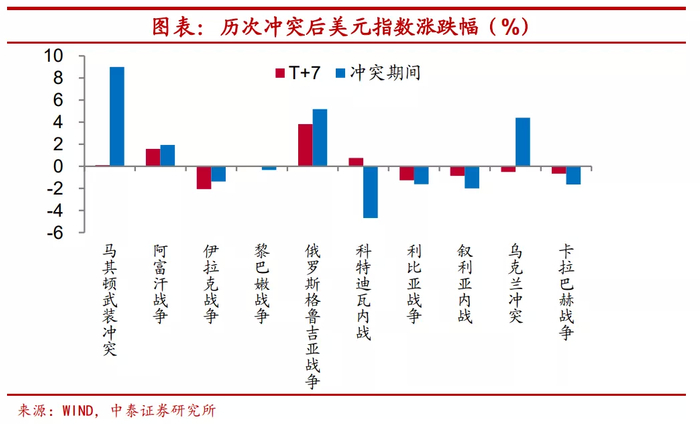 近年来,冲突爆发短期多会导致美元走弱。最后,从美元指数的走势上来看。一般而言,在地缘政治冲突等“黑天鹅”事件发生后,避险情绪升温将导致市场对美元的需求提升,从而使得美元指数上行。在新世纪以来的十次冲突爆发后一天内,美元指数似乎以2011年为节点存在明显的分化,2001至2010年爆发的冲突多会带动美元升值(除黎巴嫩战争爆发后美元指数微幅回落);而2011年后,在冲突爆发的背景下,美元指数却不升反降。