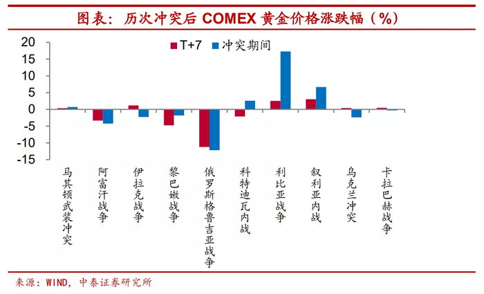 冲突爆发后,黄金价格并不必然上涨。当战争正式开始或战局明朗后,黄金价格并不必然上涨,在新世纪以来的十次地缘政治冲突期间,黄金价格5次上涨与5次下跌。一般而言,战前市场已有充分预期,而战争正式开始后,在利空出尽的背景下,黄金价格有回落的可能。