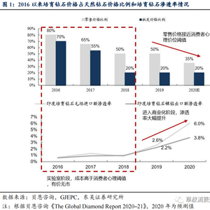 2016年培育钻石的批发价格为天然钻石的70%,零售价格为天然钻石的80%,但这个价格其实属于有价无市的情况,消费者并没有接受这个价格。直到2018年批发价格开始降到天然钻石的20%,零售价格降到天然钻石的50%,上游生产工艺和技术进步下,传导到下游零售端,2018-2020年批发价格比例维持稳定,培育钻石零售价格在2020年降到了天然钻石的35%,达到了消费者的心理价位阈值,才迎来了需求的快速增长。