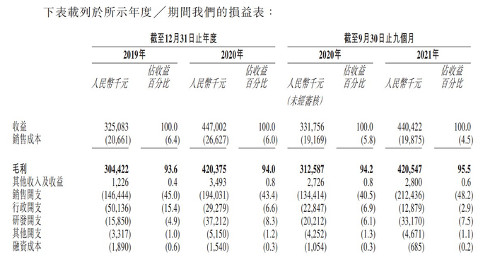 于往绩记录期间,该公司的大部分收益来自艾思瑞的销售。具体而言,于2019年、 2020年及截至2021年9月30日止九个月,艾思瑞销售收益分别为人民币3.15亿元、人民币4.37亿元及人民币4.32亿元,占同年╱期总收益的约96.8%、97.7%及 98.2%。