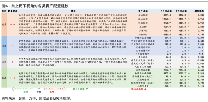 上半年的配置策略,可以采用“货币-信用”风火轮,配置结论为:股>商>债。按照今年1月社融的“开门红包”,无论是总量上还是结构上的贷款、政府债表现都不俗,但市场对稳增长落地形式、持久性的信心仍有担忧,因此数据发布后股市表现尚未扭转。如果采用“货币-信用”框架,难点在于信用数据是后验的,适合从3-6个月的角度追踪。根据国信银行团队的预测,2022年M2增量(不含货基)约20.8万亿元,对应的M2增速为8.8%;全年社融增速约为10.8%,新增社融34万亿元,较2021年的信用环境更宽松(具体请参见《重提稳增长——2022年社融和