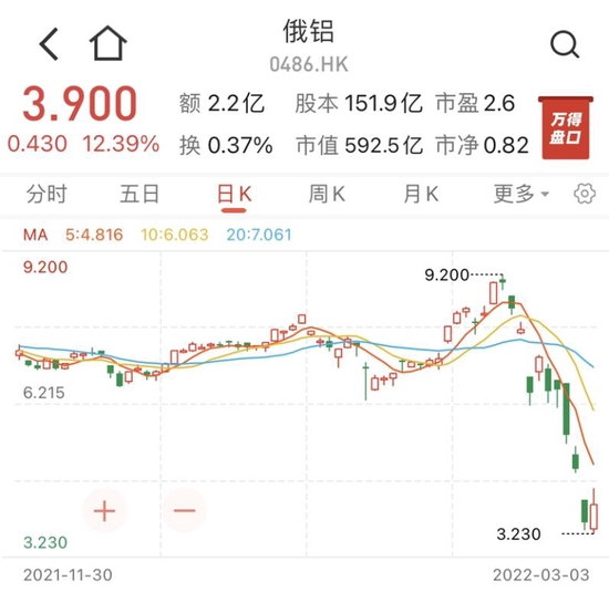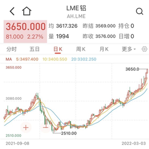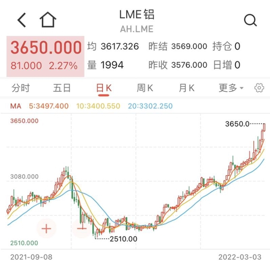 3月3日,伦敦金属交易所(LME)基准铝价续刷历史新高,最高涨至3650美元,在港股交易的俄铝前几天跟随俄罗斯股市腰斩,今天也开始大幅反弹涨超20%。