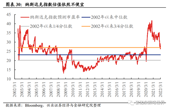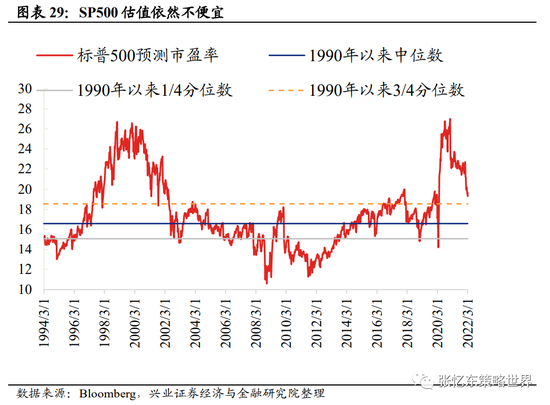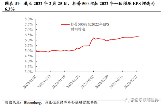 自下而上,关键还是美股当前依然不便宜——截至2022年3月1日,标普500指数一致预测市盈率为19.3,高于1990年以来的3/4分位数;纳斯达克一致预测市盈率为27.5,位于2002年以来的3/4分位数附近。截至2022年2月25日,标普500指数2022年一致预测EPS增速为6.3%。