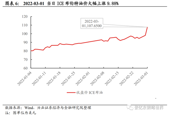 市场已开始预期西方对俄罗斯终极制裁——限制或禁止俄罗斯能源出口。俄乌战争的预期从闪电战转向持久战,叠加欧美反俄民意汹涌,市场已开始反应终极制裁俄罗斯能源出口的风险,导致油价飙升。但是,美、欧等西方国家最新制裁——禁止俄罗斯部分银行使用SWIFT支付系统,依然没有制裁俄国的石油和天然气。至少短期极限制裁的概率小。