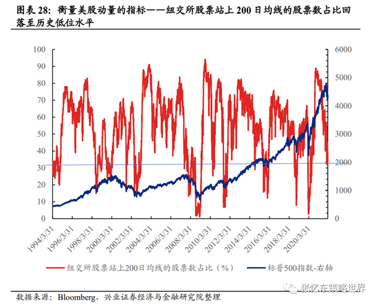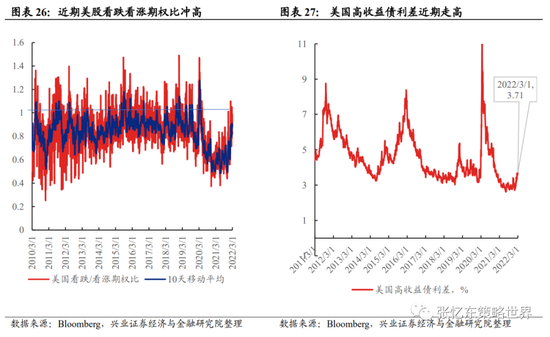 首先,短期美股市场的避险情绪已充分反应,3月有望跌深反弹。1)VIX指数已在恐慌区域:2月24日盘中一度冲高37.8,3月1日其盘中最高35.2,后续跟踪其见顶回落的迹象。2)衡量美股动量的指标——纽交所站上200日均线股票数占比回落接近极值。3)美股看跌/看涨期权比、高收益利差短期也明显冲高。