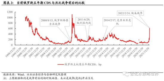 相比于1999年至今,过去有俄罗斯身影的可比战争,当前反映市场避险情绪的指标均处于极端的水平。对比历史上的战争,包括1999年科索沃战争、1999年第二次车臣战争、2008年俄罗斯格鲁吉亚战争、2011年叙利亚内战、2014年克里米亚危机。当前俄乌战争在爆发当日市场避险情绪的指标便处于极端的水平,包括,俄罗斯主权债五年期CDS、VIX指数、美债波动率等。