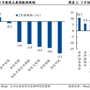截至2月28日,2月份港股主要指数中,恒生指数跌4.6%,恒生国指跌3.9%,恒生综指跌3.6%;另外,恒生小型股涨0.7%,恒生中型股跌0.3%,恒生大型股跌4.4%,恒生科技跌5.5%。行业上,恒生原材料业(涨10.7%)、能源业(涨5.9%)和必需性消费业(涨5.2%)领涨,资讯科技业(跌10.1%)、地产建筑业(跌4.5%)和医疗保健业(跌2.6%)领跌。