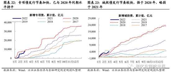 立足于内循环、稳增长的大背景下,基建相关的政策利多仍值得期待。当前,在房住不炒、不把房地产作为刺激经济的主要手段的前提下,能够快速稳经济的主要手段,依然要依靠“稳基建”。2022年财政发力前置,发债已明显提速,上半年基建投资发力值得期待。根据兴业证券宏观团队研究,2022年提前批次的新增专项债额度已于2021年12月下达,下达时间略早于2021年同期,体现政府“适度超前开展基础设施投资”的决心。专项债与城投债发行自2月中旬以来已有明显提速,截至2月26日,专项债已新增发行约8000亿元,与2020年同期水平基本一致。