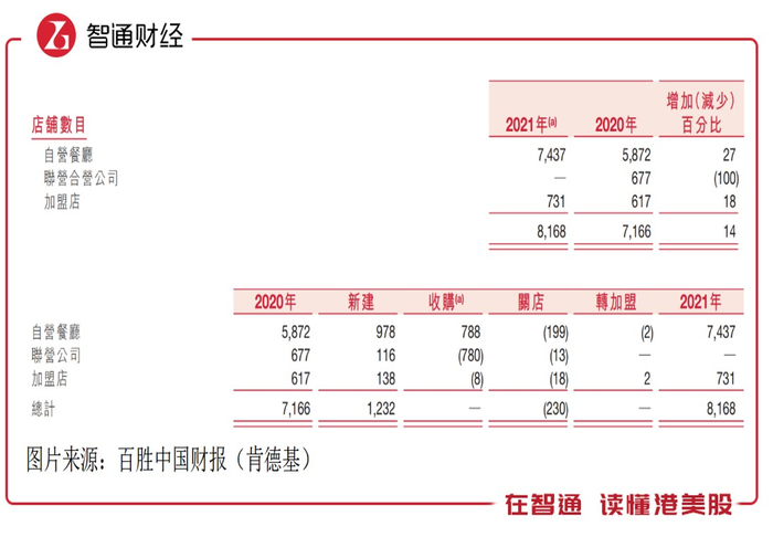肯德基是公司最核心的品牌,分布在中国超过1600个城市,提供食品包括鸡肉牛肉堡、猪肉产品、海鲜、米饭、粥、新鲜蔬菜、甜品、咖啡及茶饮等。该公司通过新建及收购方式扩张餐厅,2021年拥有自营店7437家,全年新增1565家,增长达27%,加速加盟店8168家,增长14%。
