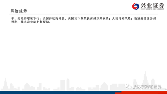 风险提示:中、美经济增速下行;美国持续高通胀,美国货币政策提前超预期收紧;大国博弈风险;新冠疫情变异超预期;俄乌局势演变超预期。