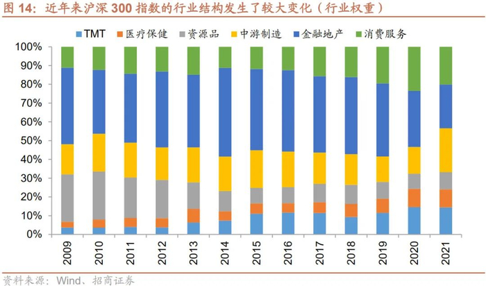 拉长时间来看,沪深300指数的行业分布发生了较大变化,新兴产业占比扩大,行业分布更加均衡。过去十几年,国内产业结构转型,推动了消费、医药、科技等新兴产业快速发展,这些行业也有越来越多公司跻身A股市值排行榜前列,并纳入沪深300指数。我们看到近年来沪深300指数中,TMT、医药、消费服务等行业的占比持续扩大,新能源为主的电力设备行业也成为沪深300指数中排名前5的行业。相比之下,代表传统产业的上游资源品、金融地产等占比持续收窄。