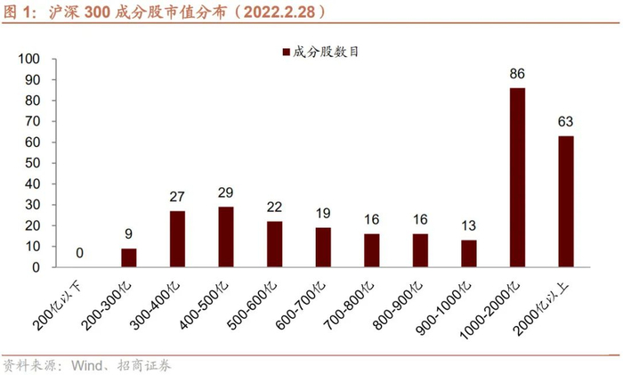 沪深300指数由沪深两市A股中规模大、流动性好的最具代表性的300只股票组成,属于典型的大盘风格。截止2022年2月末,沪深300指数成分股中,近一半公司(149家)市值超过1000亿元,其中86家公司市值介于1000亿至2000亿之间,63家公司市值为2000亿以上。