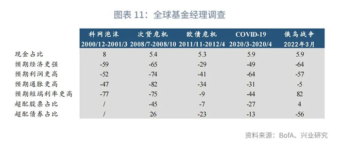 近期全球市场,特别是股票市场的表现是增长预期下行导致基金经理主动降低仓位所致,而不同区域抛售幅度存在差异则与各自基本面因素有关,尚不是2020年3月那种无差别抛售。根据美银美林3月全球基金经理调查显示,投资者对于全球经济增长预期已经跌至2008年次贷危机以来的最低水平,全球基金经理股票持仓也降至2020年3月以来最低,而现金持仓则升至2020年3月以来最高。