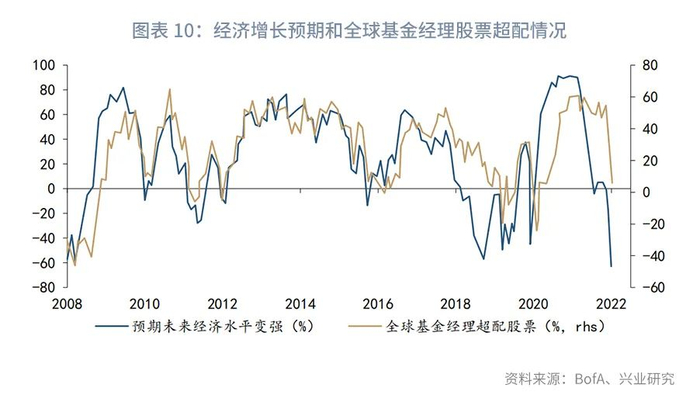 不同经济体债券收益率则是另一番景象,2020年3月10日前后多数国家十年期国债收益率短暂回落后出现上行,幅度差异较大。而本轮主要经济体10年期国债收益率在俄乌战争爆发后有短暂回落之后共振上行,幅度相当。此轮债券抛售主要与过去四十年的低利率时代结束有关,债券市场已经连续两个月净流出,目前全球基金经理对于债券的低配程度也是2000年以来类似经济环境下所未有过的,而且可能仍将进一步下降。